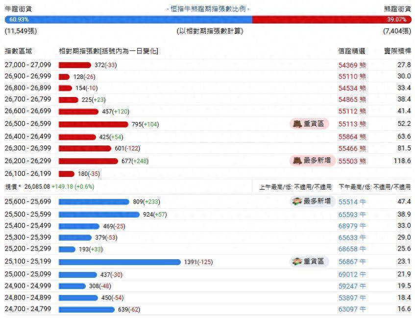 牛证街货重货区在25100-25199区间,该区间最新牛证数量为1391张,较上一交易日减少125张;牛证街货最多新增在25600-25699区间,该区间最新牛证数量为809张,较上一交易日增加233张。